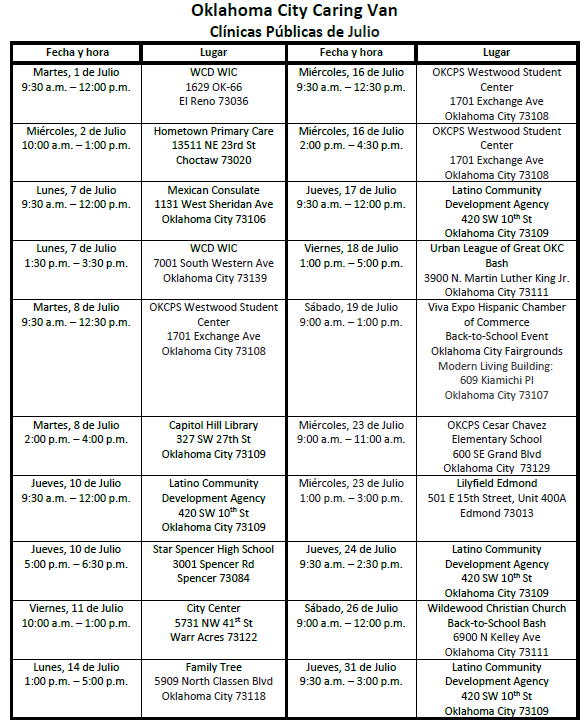 Se sostendrán clínicas en varias localidades alrededor del área metropolitana de Oklahoma City y Tulsa