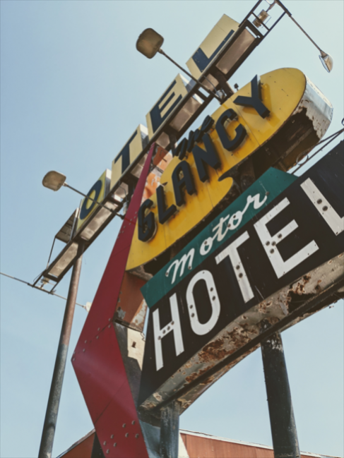 The Glancy Motor Hotel was opened in 1950 by Chester and Gladys Glancy. The property in Clinton saw hundreds of thousands of visitors during the heyday of Route 66. With the construction of the interstate and subsequent loss of traffic along Route 66, the Glancy Motor Hotel would face the same fate as many other businesses along the highway. It eventually closed during the 1970s. Despite joint public and private efforts to keep the hotel preserved as a historic property, the building was demolished in 2023. The only remaining piece of the Glancy Motor Hotel is the neon sign that once stood outside it, preserved by the City of Clinton in the hopes of a future relighting.